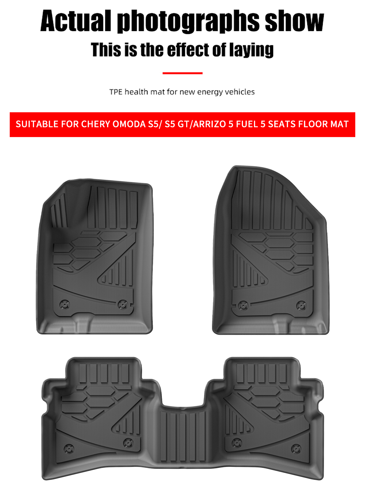 | Non-toxic: TPE material is free from harmful substances, ensuring safe car air quality. Eco-friendly: Certified and 100% recyclable. Precision Fit:Using 3D laser scanning, our TPE mats are designed to perfectly fit your car's interior. Suitable for any car model, providing full protection. Easy to Clean: Simply rinse with water, no chemical cleaners required. Durable: Highly wear-resistant, long-lasting, and withstands multiple cleanings. Easy to clean:professional groove design can collect water, snow, mud and sand to protect the floor of your car. Safe:no throttle stuck, no looseness, no displacement. Environmentally friendly and odorless, high temperature resistant. |